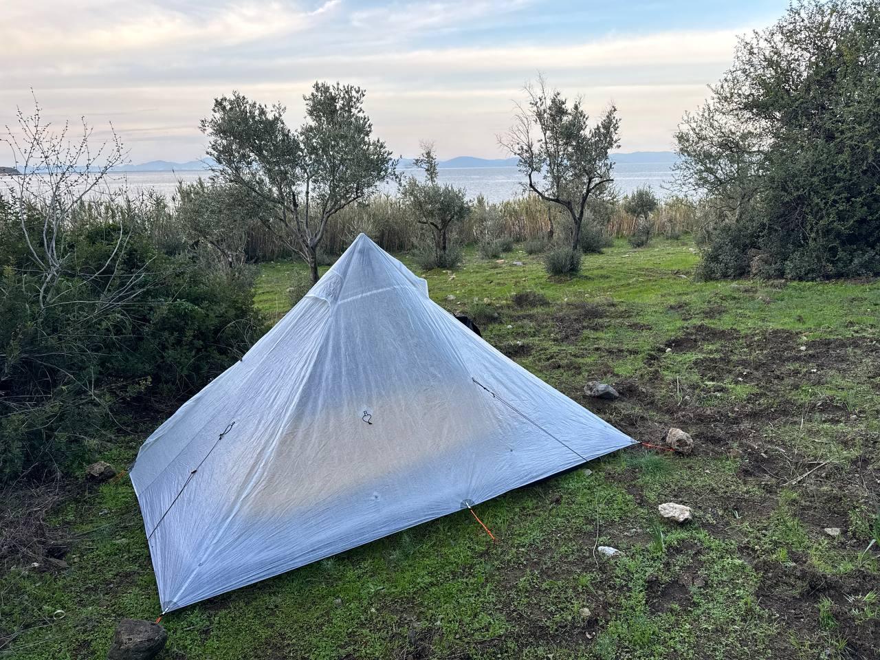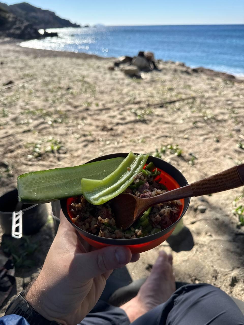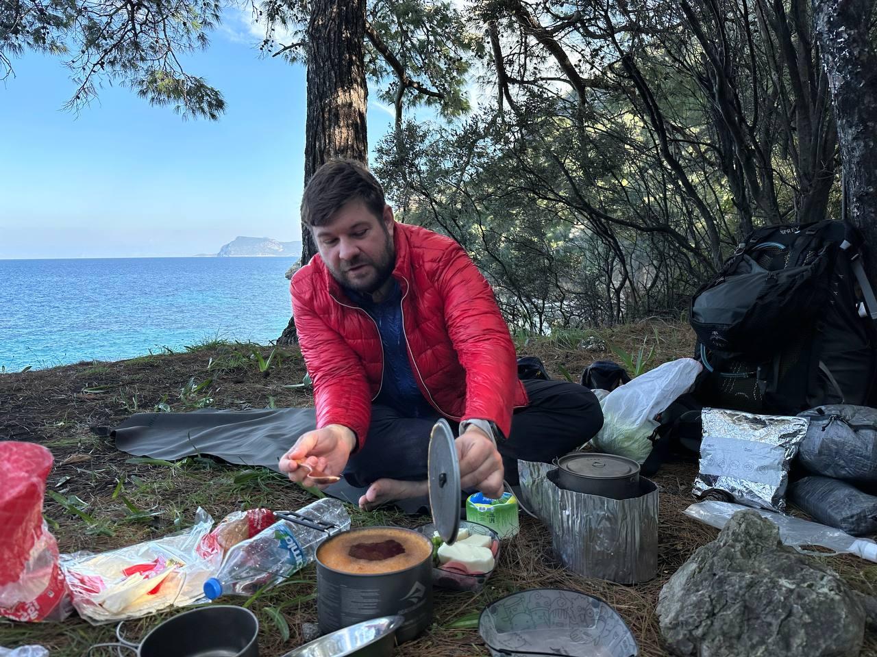 Заночевали на берегу моря. Прошли 11 км, вечером было около 8 градусов, ночью около 12, но влажность 89 процентов.