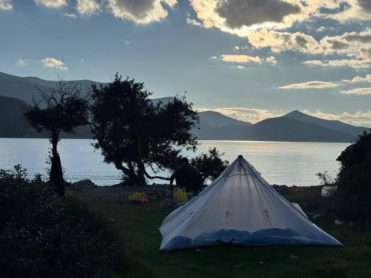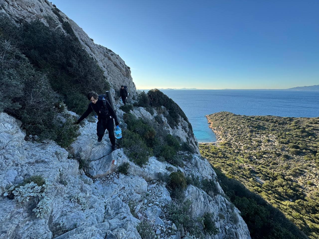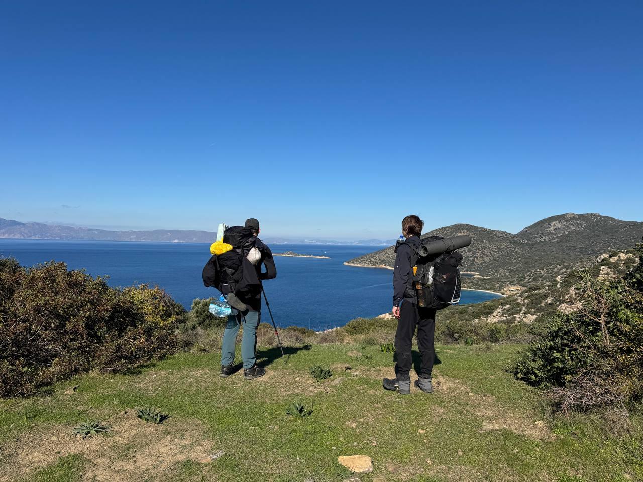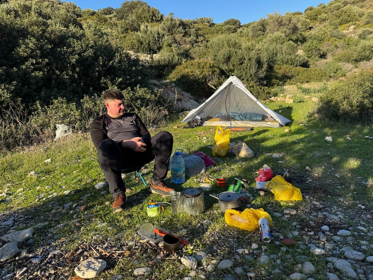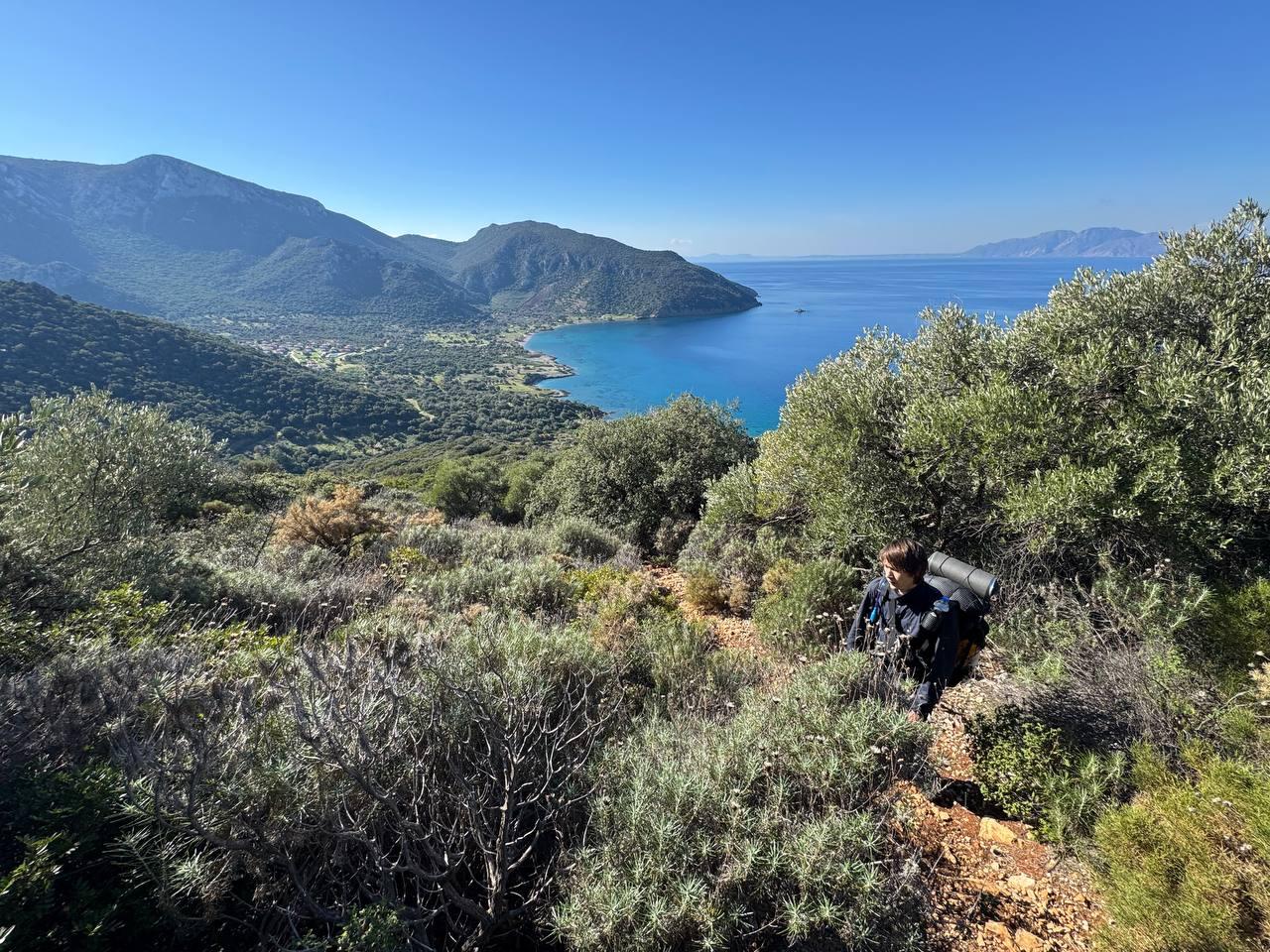 План был заночевать на пляже прямо за Книдосом, но не нашли спуска и пошли еще полтора км до плато где и заночевали, прошли около 19 км.