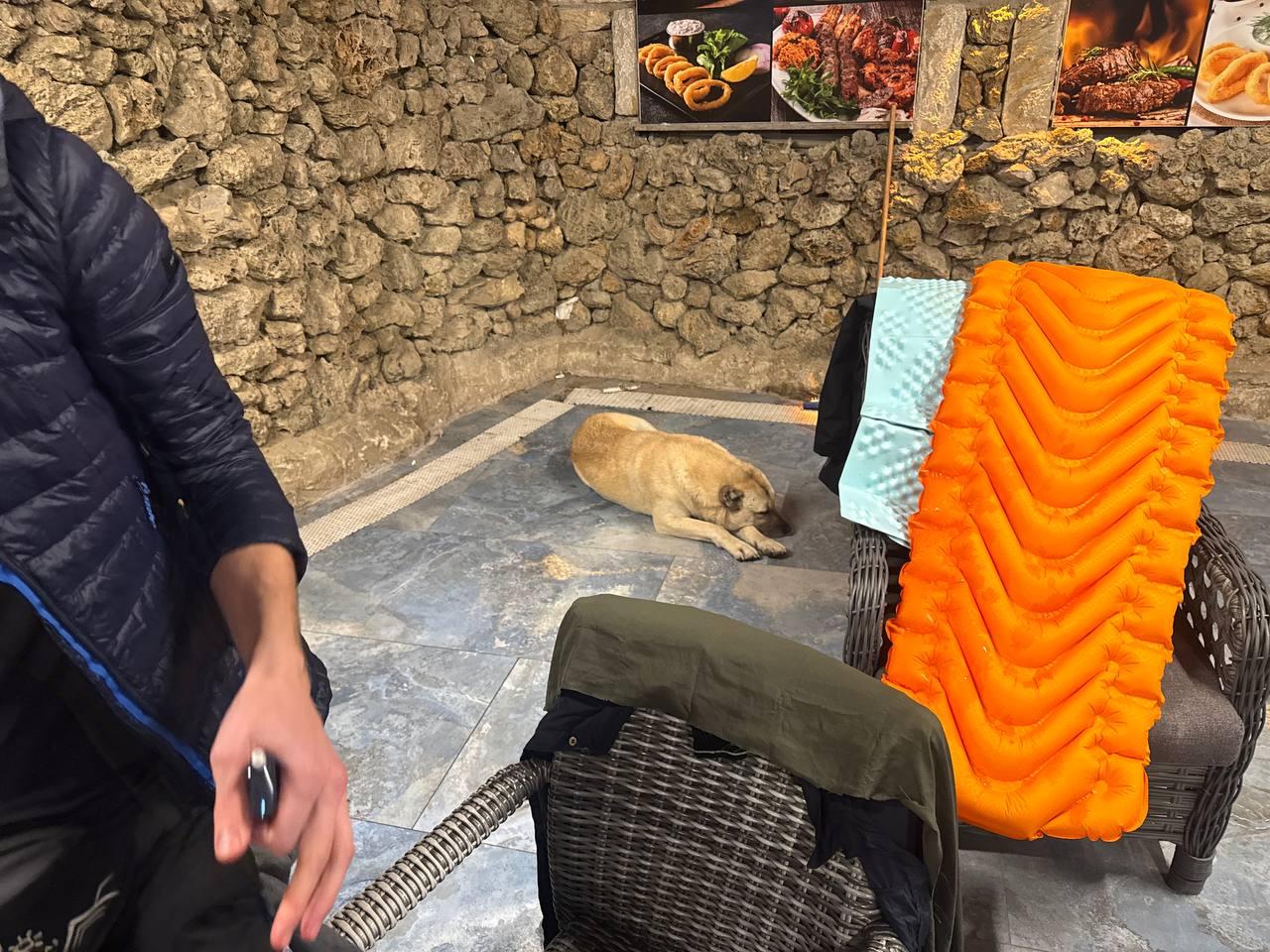 Кстати все три дня, включая нулевой нас сопровождает вот такая, собака, ужин мы заказали и на нее в том числе, и потом пустили ее в тепло к нам.