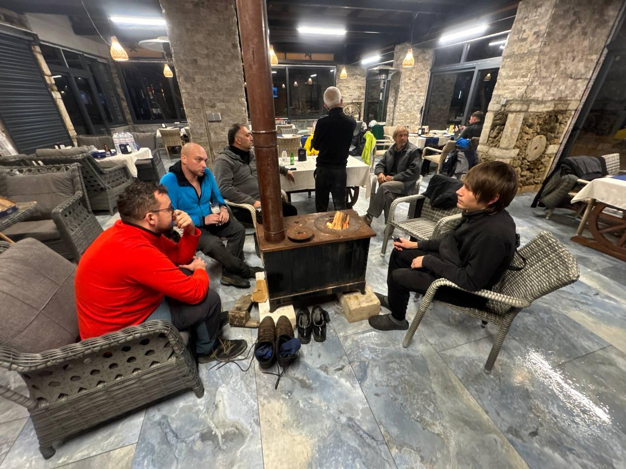 Спустились в деревушку, зашли поужинать и нас приютили разрешив остаться прямо в ресторане и спать на полу. Мы согласились так как за окном опять бушует сильный порывистый ветер, а тут печка и дрова.
