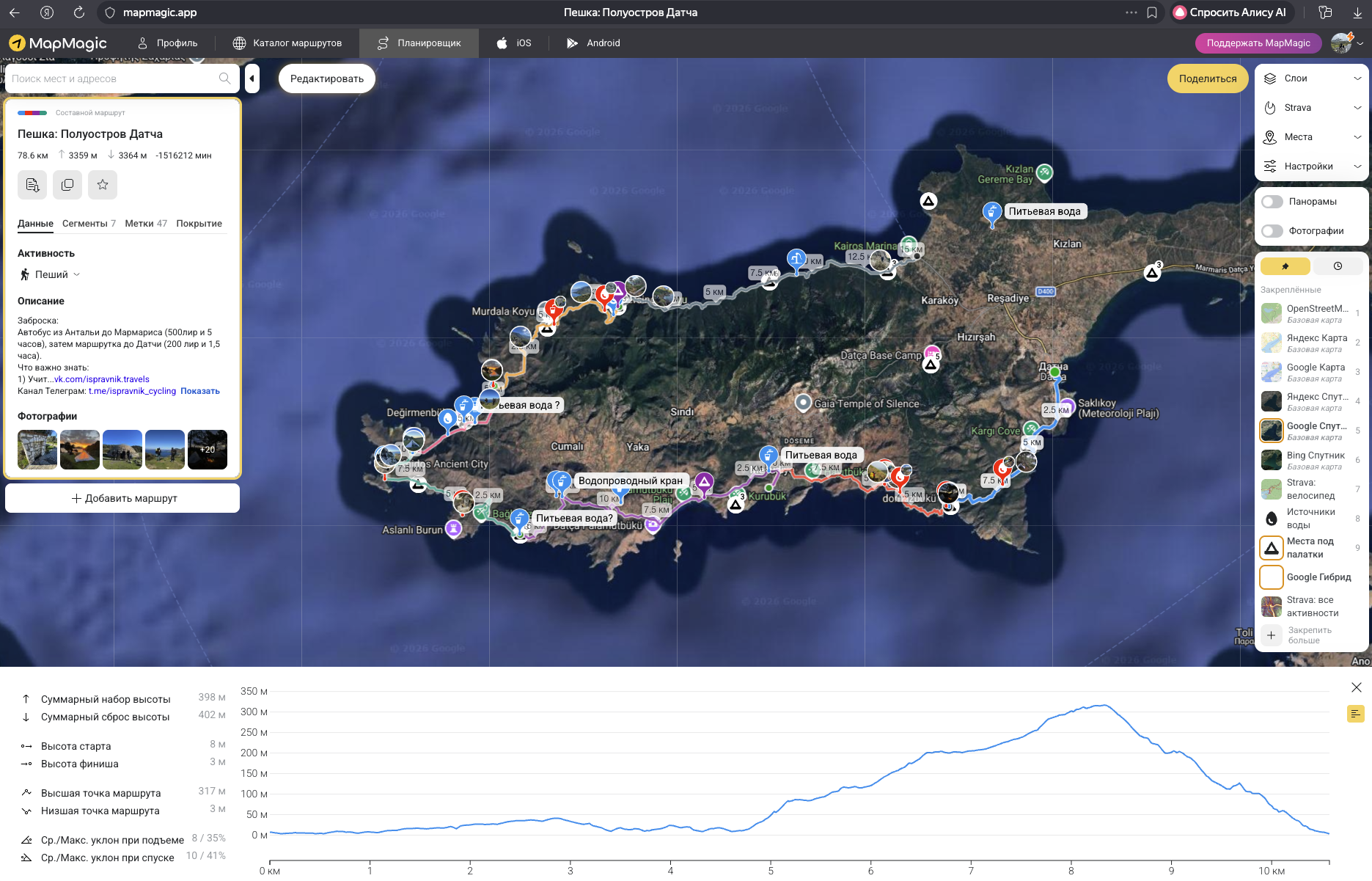 Карта маршрута с пометками воды, описанием, фотографиями с привязкой к треку и возможностью скачать GPX — доступна на Boosty и в VK Donut. Спасибо всем кто меня там поддерживает.